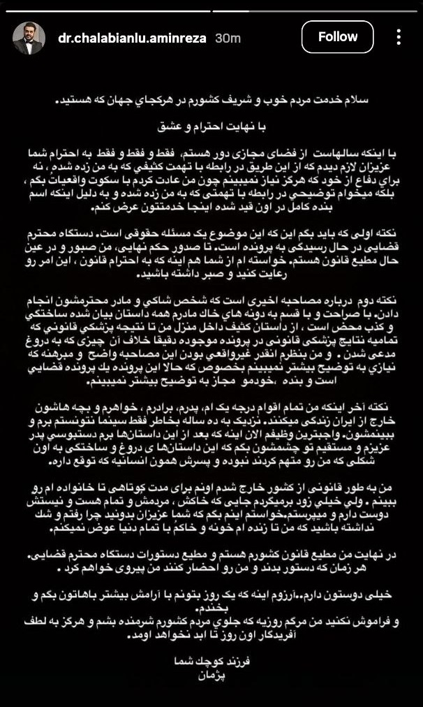 نکته دوم درباره مصاحبه اخیری است که شخص شاکی و مادر محترمشون انجام دادن. با صراحت و با قسم به دونههای خاک مادرم همه داستان بیان شده ساختگی و کذب محض است، از داستان کثیف داخل منزل من تا نتیجه پزشکی قانونی که تمامی نتایج پزشکی قانونی در پرونده موجوده دقیقا خلاف آن چیزی که به دروغ مدعی شدن. و من بنظرم انقدر غیرواقعی بودن این مصاحبه واضح و مبرهنه که نیازی به توضیح بیشتر نمیبینم بخصوص که حالا این پرونده یک پرونده قضایی است و بنده، خودمو مجاز به توضیح بیشتر نمیبینم.