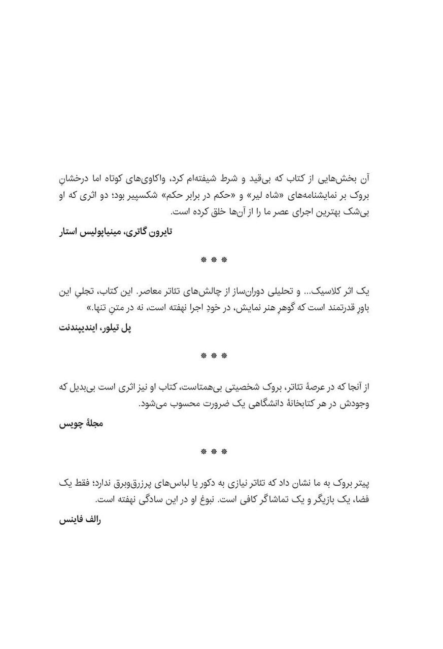 بروک در اثر حاضر از این راز پرده برمیدارد که تئاتر چگونه مرزهای واقعیت و خیال را درمینوردد، توهم را به اوج کمال میرساند و در لحظهی اوج، آن را فرو میپاشد تا حقیقتی برتر را در جانِ تماشاگر بنشاند؛ حقیقتی که گذشت زمان، غبار فراموشی بر آن نخواهد نشاند.»