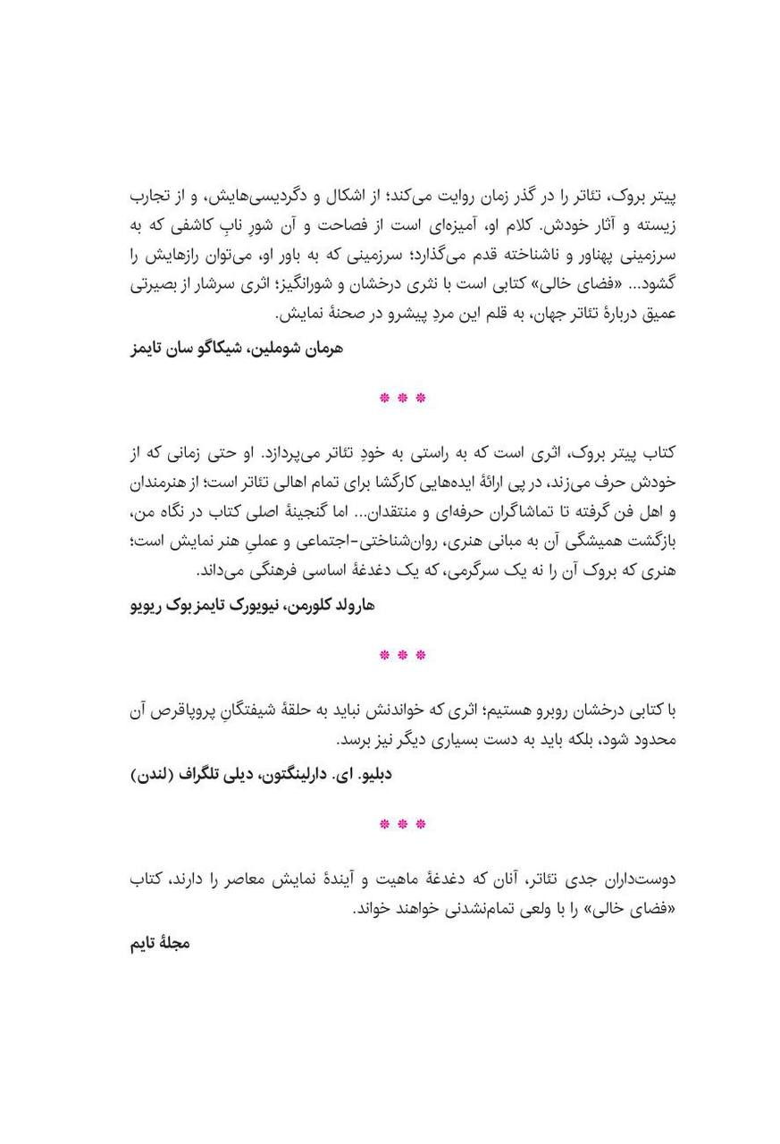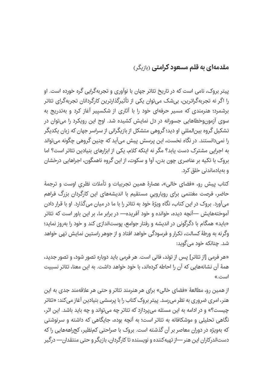 «فضای خالی» بیش از آن که یک کتاب باشد، منشوری است برای نگریستن به تئاتر. اثری که به صحنهگردانان و شیفتگان این هنر میآموزد چگونه از هیچ، جهانی بیافرینند و به جوهرۀ یک اجرا دست یابند.