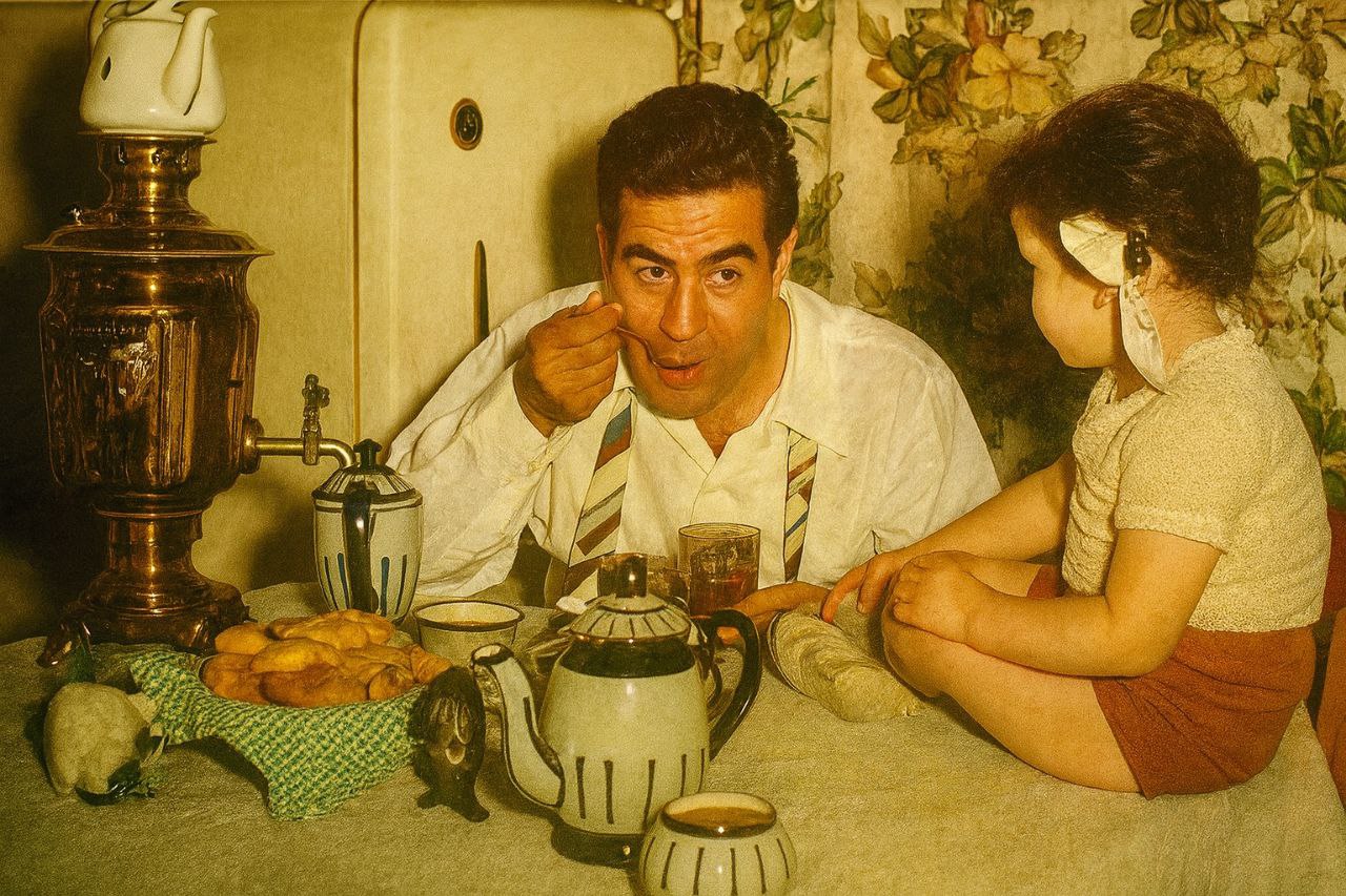 آشپزخانهای با سماور برنجی براق، سرویس چایخوری طرحدار، پردههای گلدار و یخچال قدیمی؛ دکوری که تماماً نشانههای یک خانه ایرانی پیش از انقلاب است. این صحنه در کنار دخترش، تصویری کوتاه اما پر از نوستالژی از روزگاری ساده و صمیمی را زنده میکند.