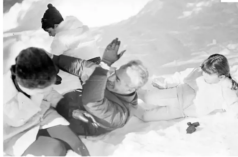 تصویری از برف بازی فرح و محمدرضا پهلوی و فرزندانش مشاهده می کنید.