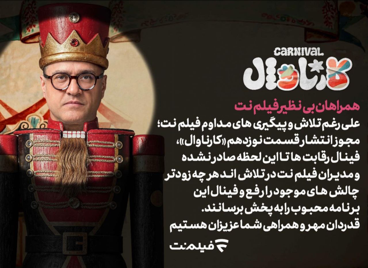 در بخشی از این بیانیه آمده: «علیرغم تلاش و پیگیریهای مداوم فیلمنت، مجوز انتشار قسمت نوزدهم «کارناوال»، فینال رقابتها تا این لحظه صادر نشده». در ادامه به این اشاره شده که مدیران فیلمنت در تلاشاند هر چه زودتر با رفع چالشهای موجود، امکان پخش فینال «کارناوال» را فراهم کنند.