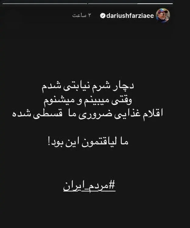 او نوشت که وقتی میبیند ماست، لبنیات و دیگر نیازهای روزمره مردم قسطی شدهاند، دچار شرم نیابتی میشود و این شرایط را ناعادلانه دانست. عمو پورنگ تاکید کرد: ما لیاقتمون این نبود!