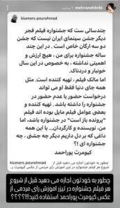 «چطور به خودتون اجازه میدهید قبل از شروع هر فیلم جشنواره در تیزر آموزش رای مردمی از عکس کیومرث پوراحمد استفاده کنید!؟»