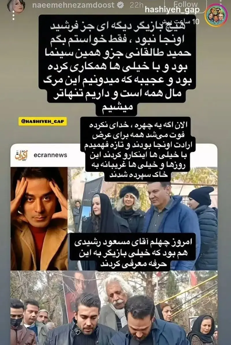 نعیمه نظامدوست با انتشار یک استوری از غایبین مراسم خاکسپاری حمید طالقانی انتقاد کرد.